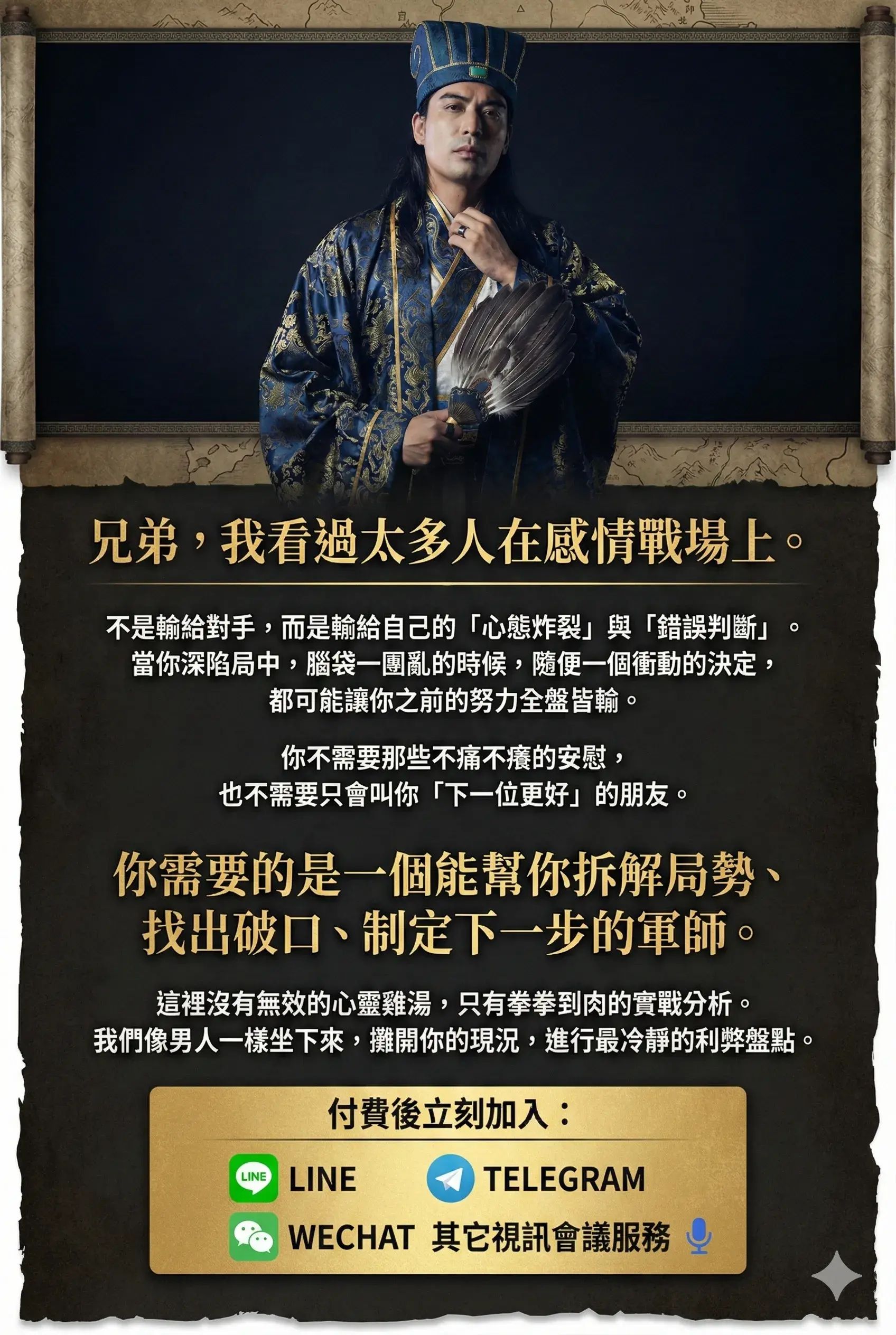你不需要那些不痛不癢的安慰,也不需要只會叫你「下一位更好」的朋友。你需要的是一個能幫你拆解局勢、找出破口、制定下一步的軍師。